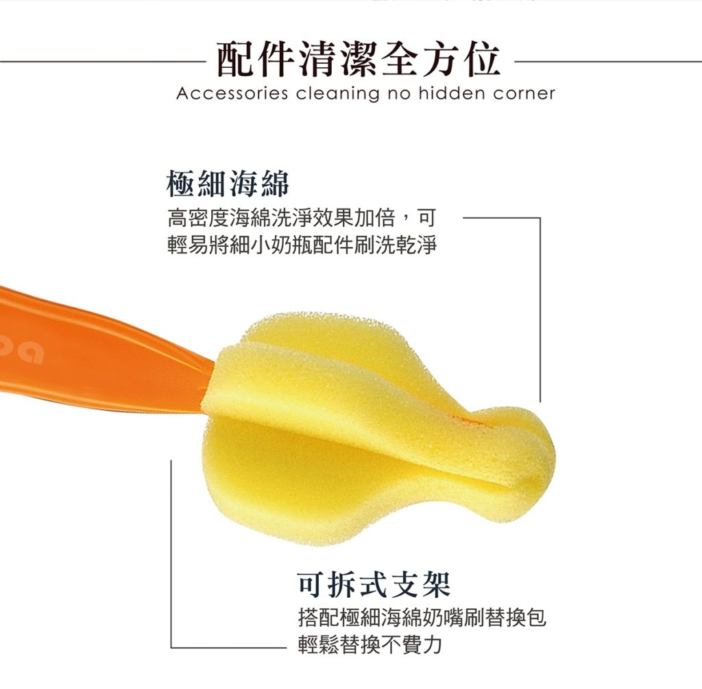 - 嚴選極細高密度海綿,透氣快乾,不易滋生細菌,不刮傷奶嘴。
